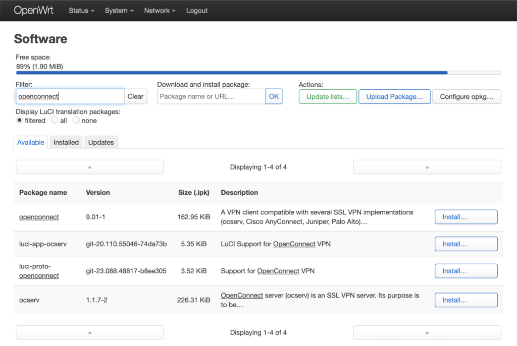 Установка пакетов openconneсt и luci-proto-openconnect