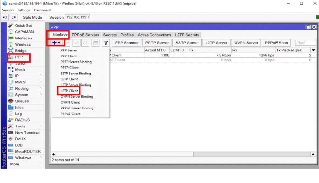 Открываем PPP -> Interface -> «+» -> L2TP Client