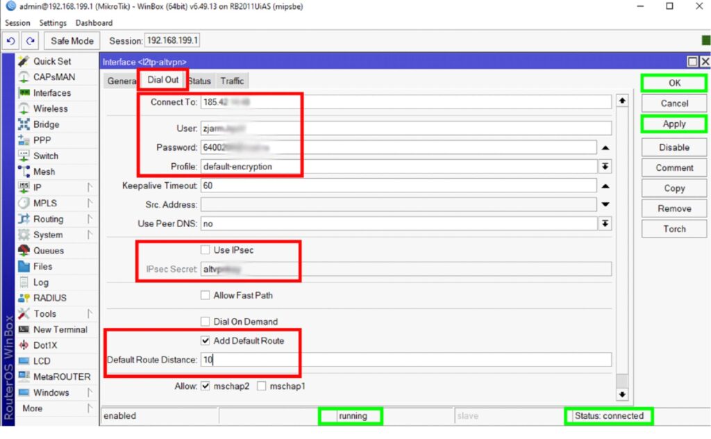 Нажимаем Apply, должно снизу появиться «running» (запущено) и «Status: connected» (соединено). Если не появляется – проверяем все поля, пробуем другой IP-адрес сервера из списка, пробуем другой профиль соединения, пробуем «Use IPSec». Пока не появится статус «connected», далее можно не переходить. Если появилось – нажимаем «OK» и переходим к следующему шагу.